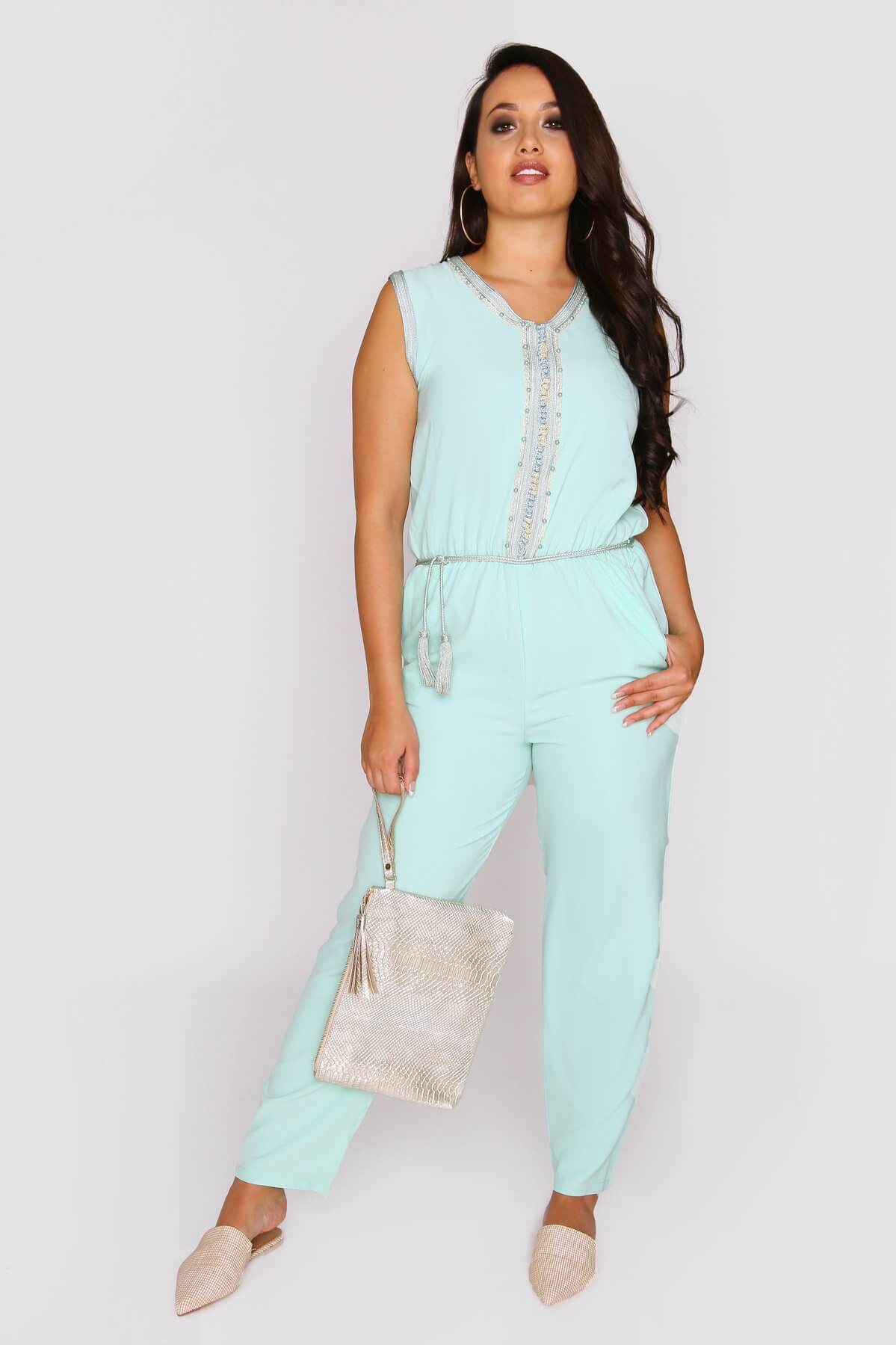 In a fresh water green palette, the Amazon jumpsuit is a perfect choice for any event this summer. Featuring a modest high neckline, the relaxed cut is fitted at the waist with a comfortable elasticated waistband and finished with an adjustable rope-effect belt. Metallic embroidery and pearl embellishment complete the detail.