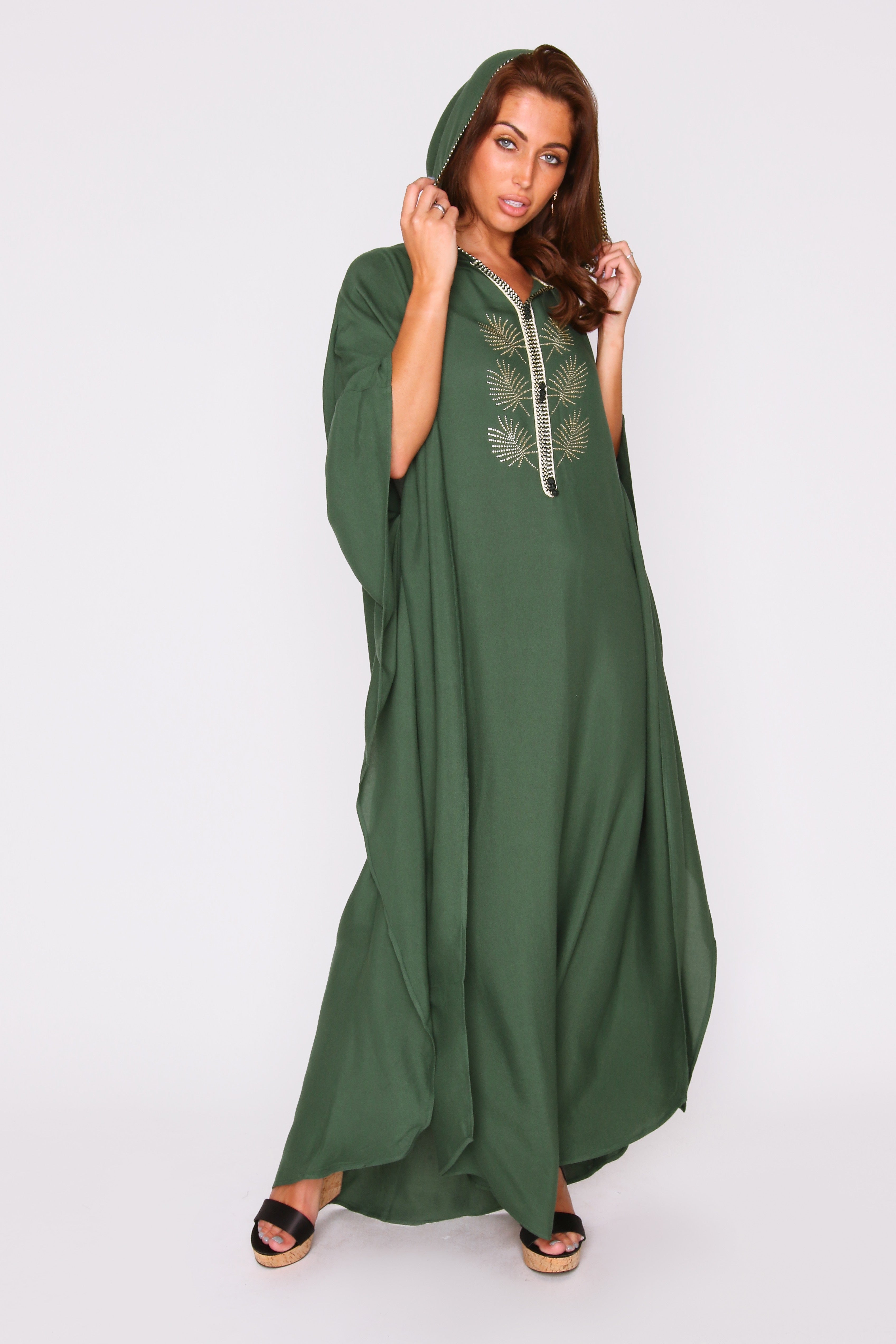 Kaftan Ludmila Cropped Sleeve Hooded Crystal Maxi Dress in Emerald Green