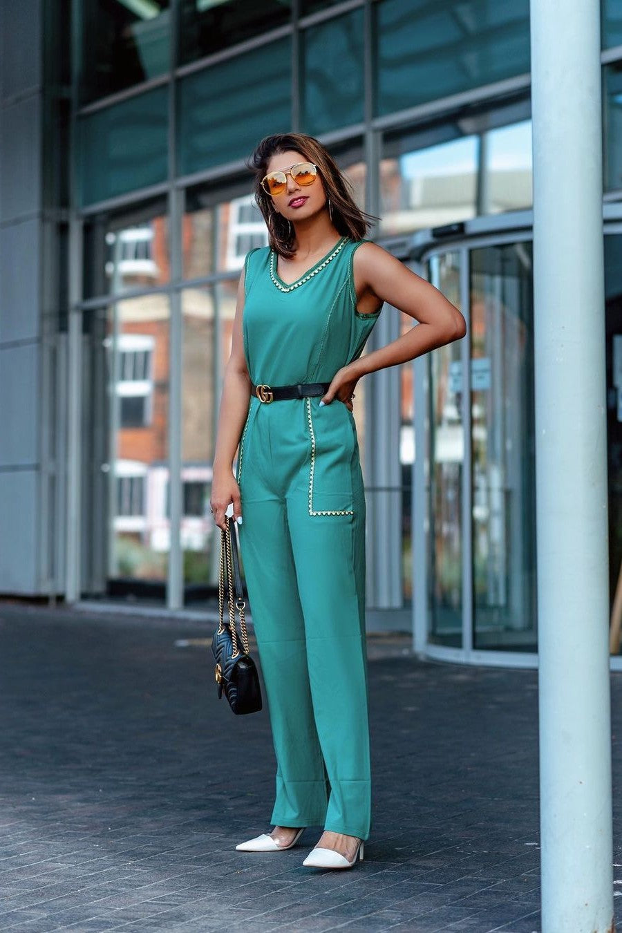 Anicet Embroidered Trim High V-Neck Sleeveless Evening Full-Length Jumpsuit in Khaki Green