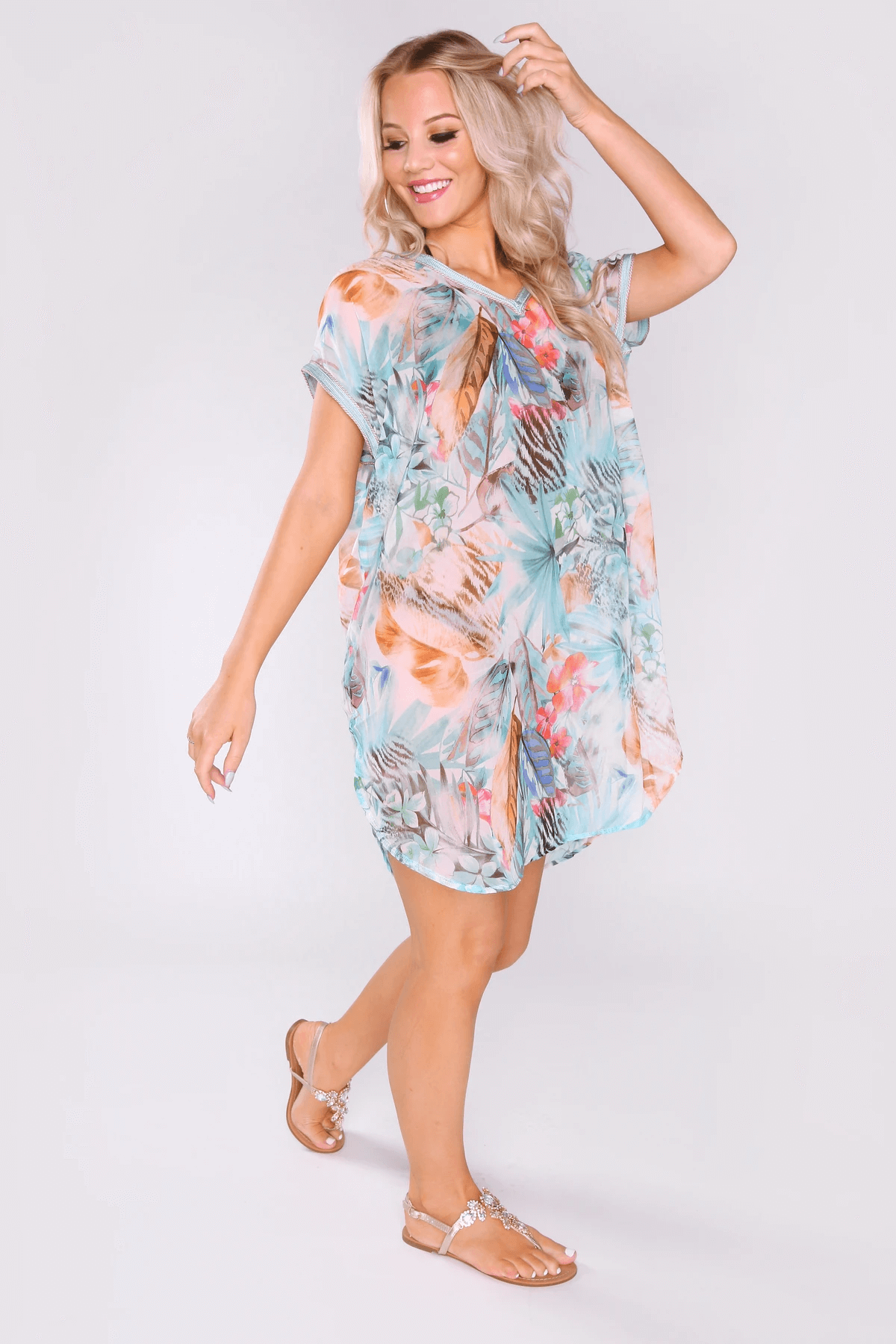 A shorter kaftan, perfect for the beach, the Alyse is cut to above the knee in a light-weight and effortlessly flowing chiffon fabric, complete with a bright and beautiful abstract floral print.