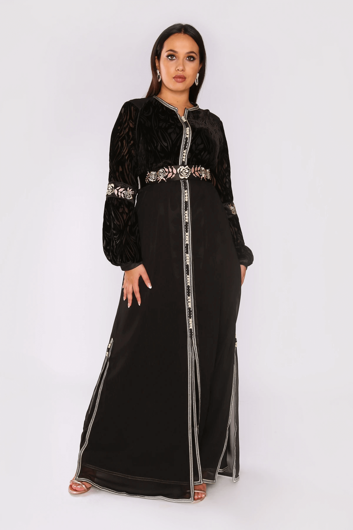 Lebssa Edwige Special Occasion Formal Long Dress with Sheer Velour Sleeves and Belt in Black