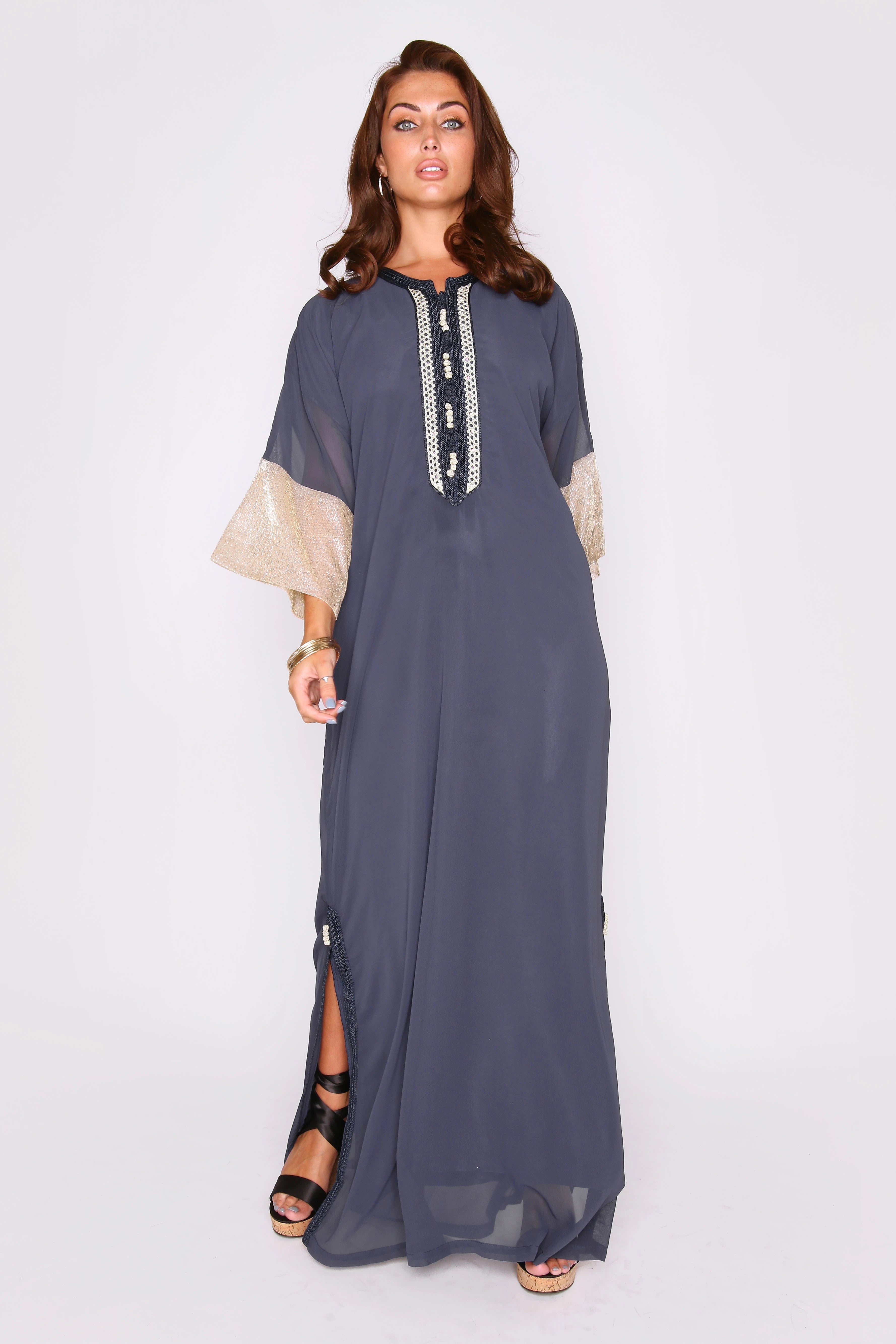A striking kaftan dress that is perfect for anything from formal parties and events to summer evenings on holiday, this beautiful design is lightweight and exudes elegance. The slightly cropped sleeve is finished with metallic gold panelling which effortlessly compliments the embroidery while the full-length fabric creates movement with every step.