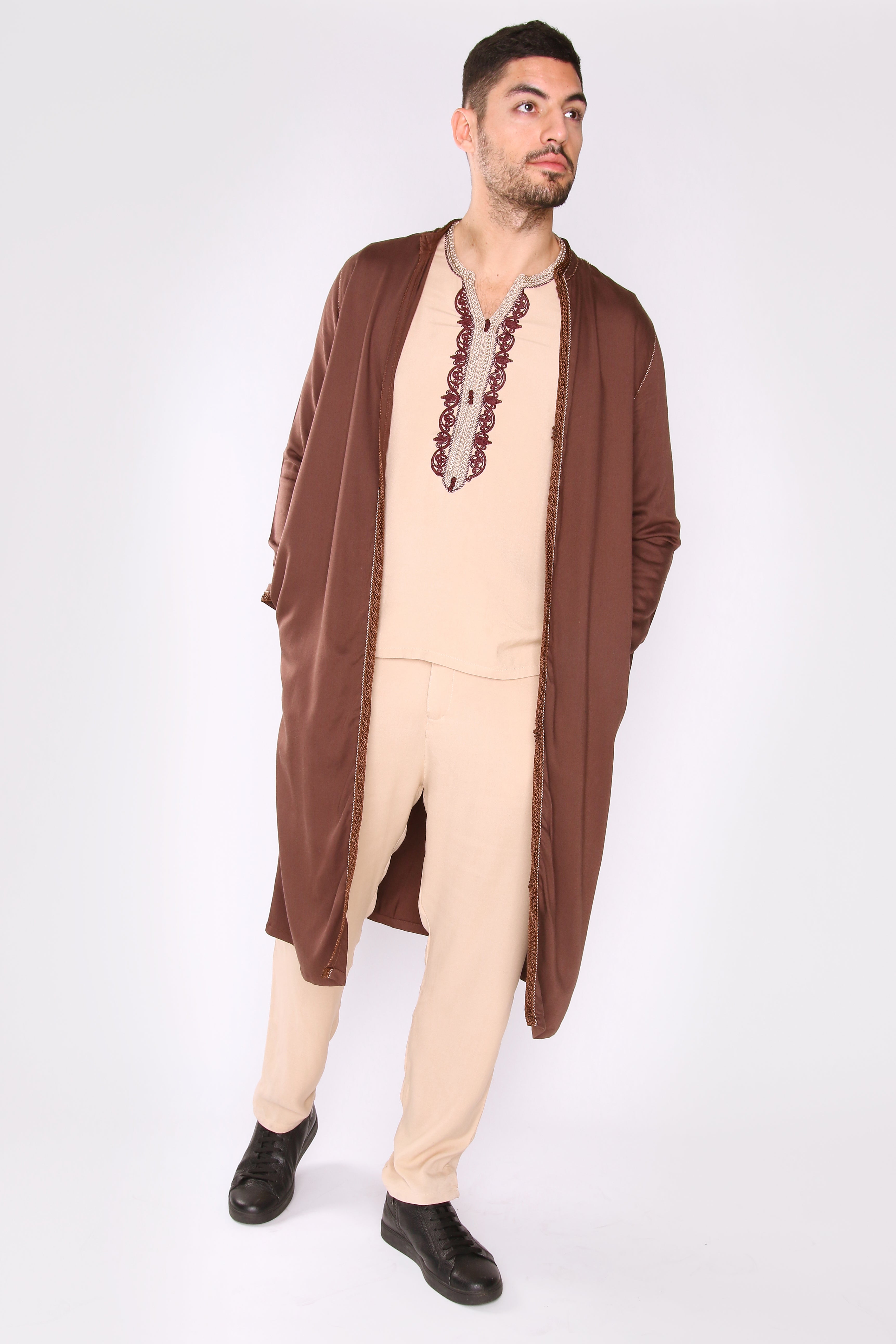 Jabador Assem Men's Tunic Top Longline Jacket and Trousers Embroidered Co-Ord Set in Brown
