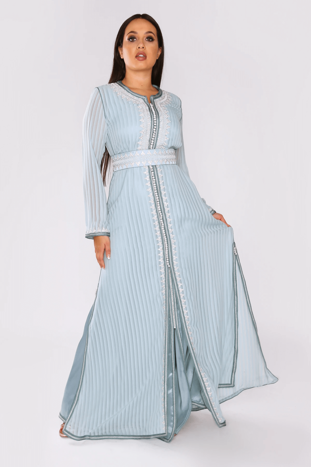 Ethereal and elegantly subtle, the palette of the Utopia lebssa is soft, pastel and effortlessly on trend. In a modern striped chiffon, the long-sleeved dress uses traditional accents to cinch the waist for an hourglass shape while maintaining that all-important modest feel.