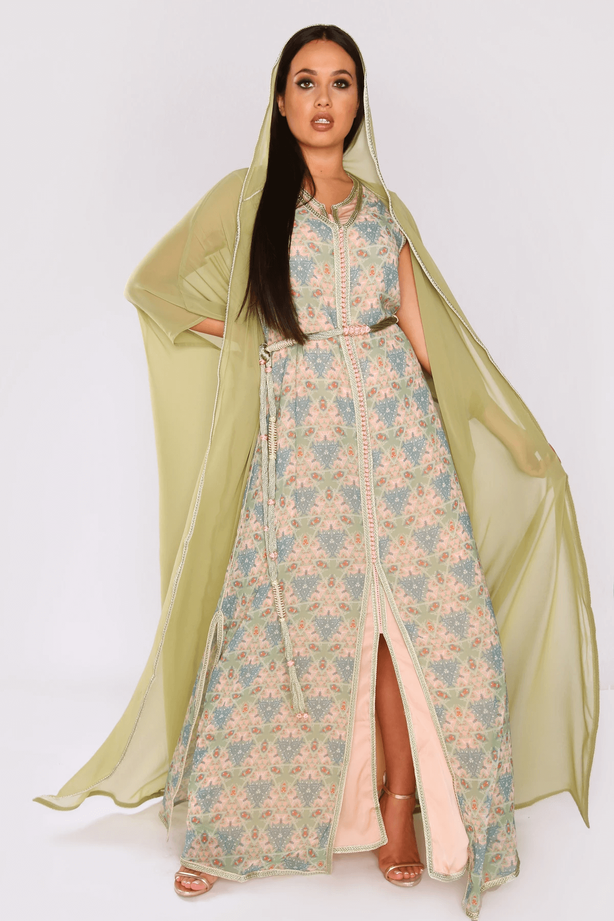 This full-length special occasionwear dress is the perfect choice for an event this summer or autumn. With a palette of greens and soft salmon pint, the Moroccan-inspired print adds some authentic detail to your wardrobe, best paired with simple accessories and shoes.