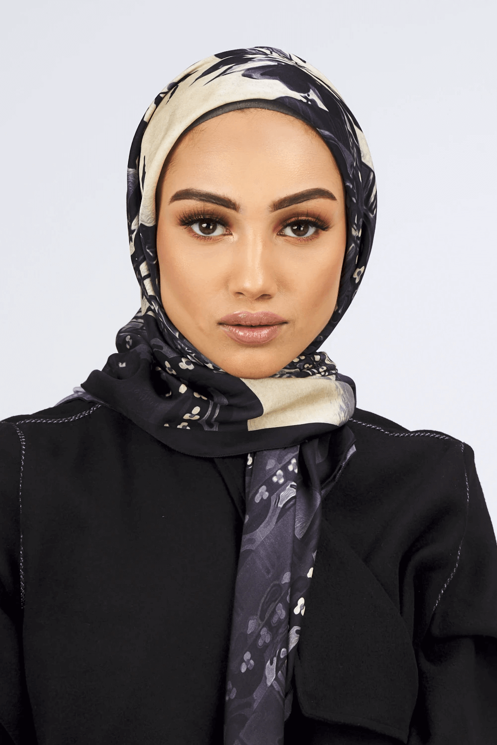 Opt for effortless style with this stunning deep blue and beige print silk satin scarf. The perfect piece to give a little extra detail to your look, pair with neutral and wear either around the hair or shoulders and neck.
