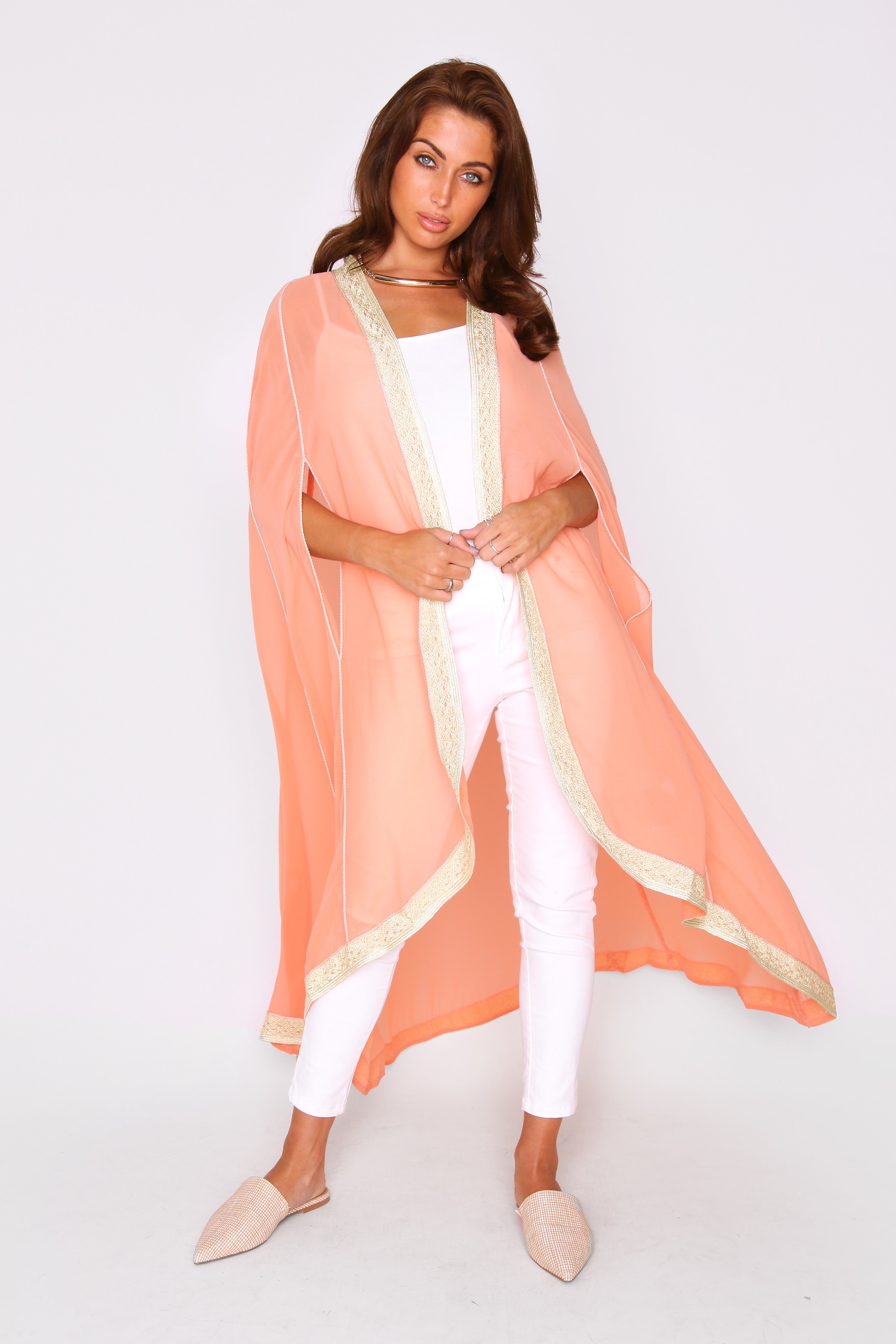 Amalthe Contrast Trim Lightweight Chiffon Sheer Cape Duster Jacket in Salmon