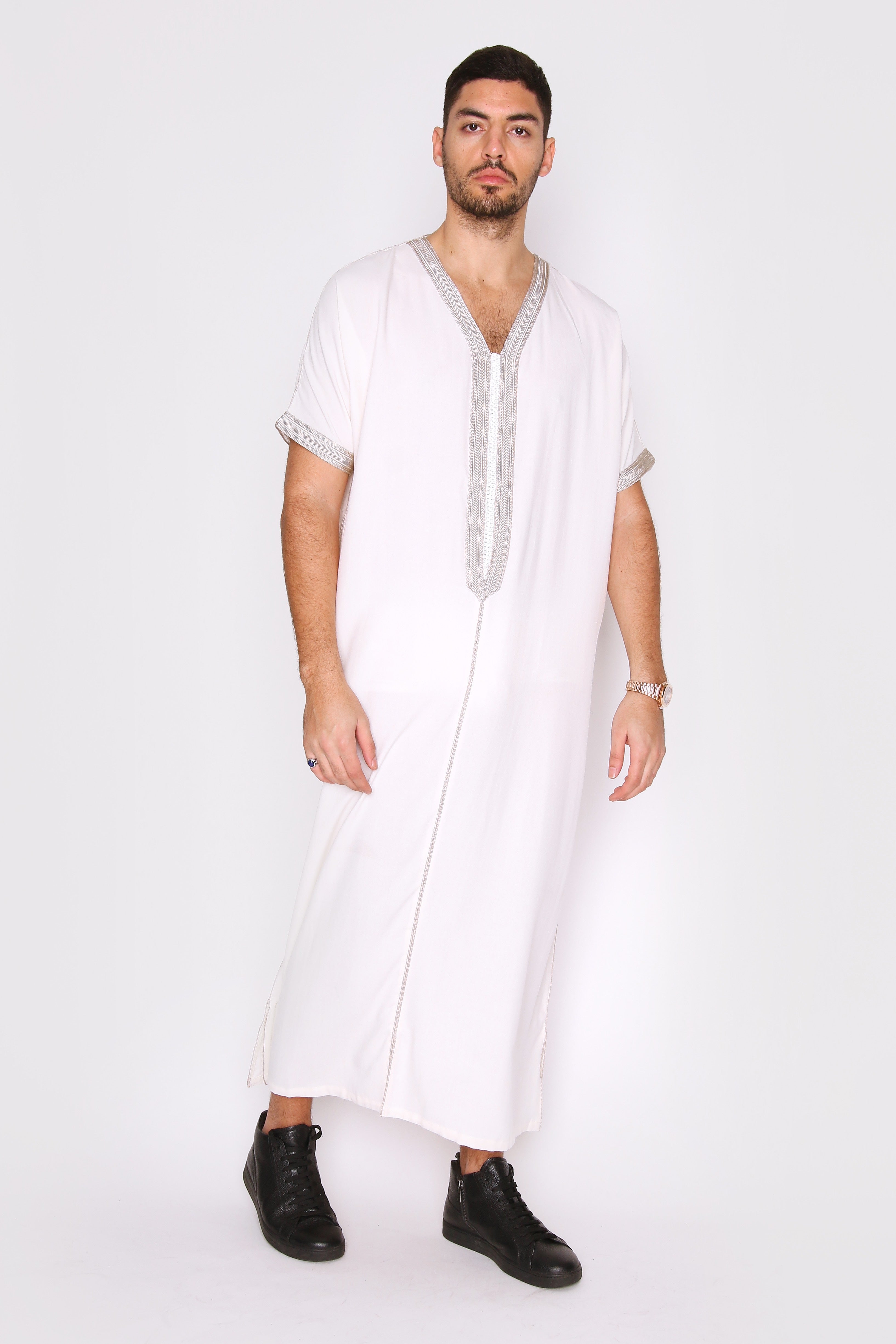 Gandoura Dolphy Men's Short Sleeve V-Neck Robe Thobe in White