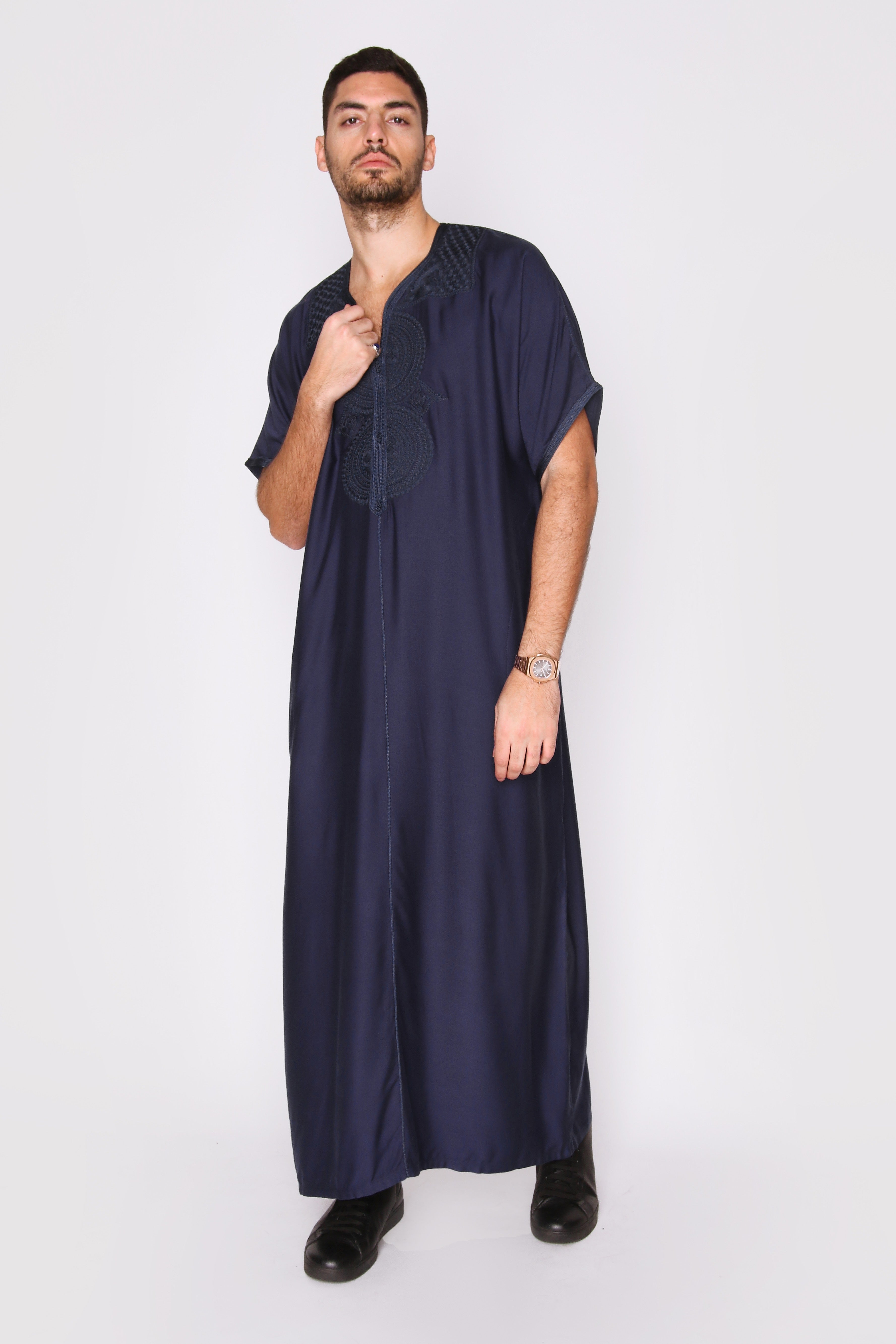 Gandoura Idriss Men's Embroidered Short Sleeve Full-Length Robe Thobe in Rich Deep Blue