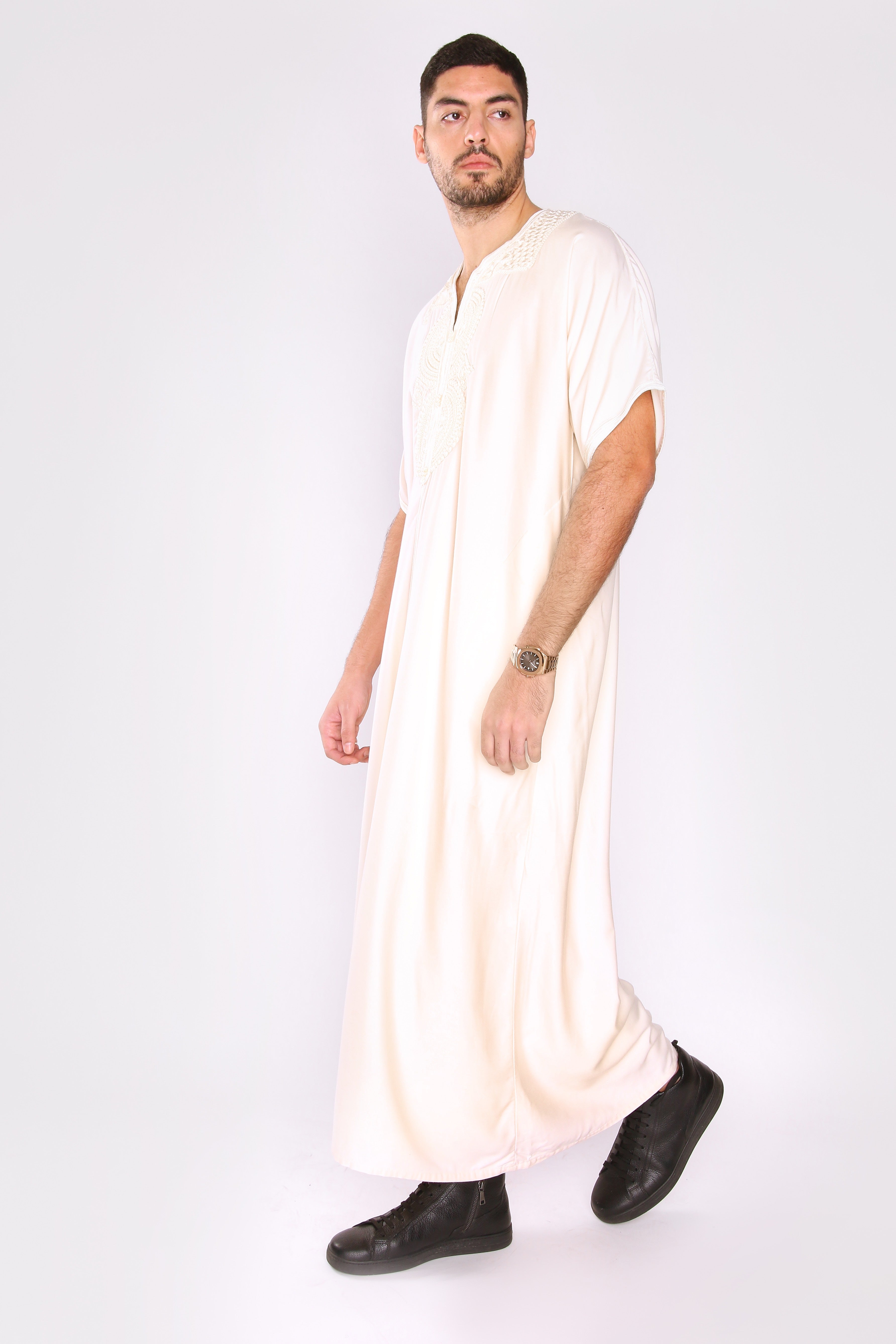 Gandoura Idriss Men's Embroidered Short Sleeve Full-Length Robe Thobe in Bright White