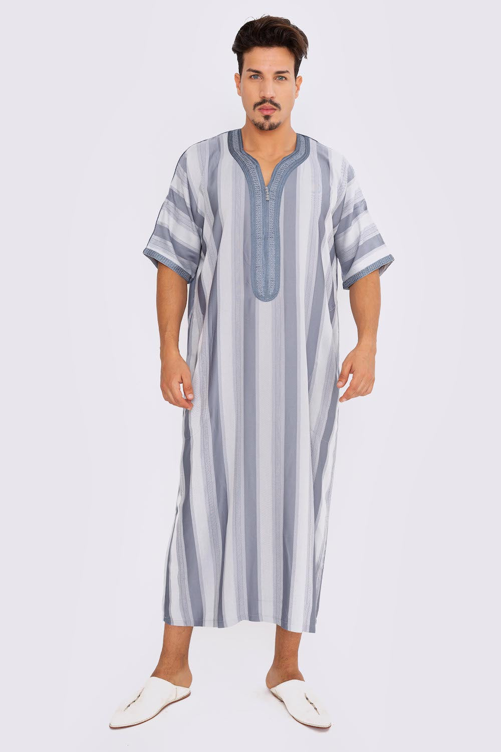 Gandoura Men's Short Sleeve Long Striped Thobe in Grey
