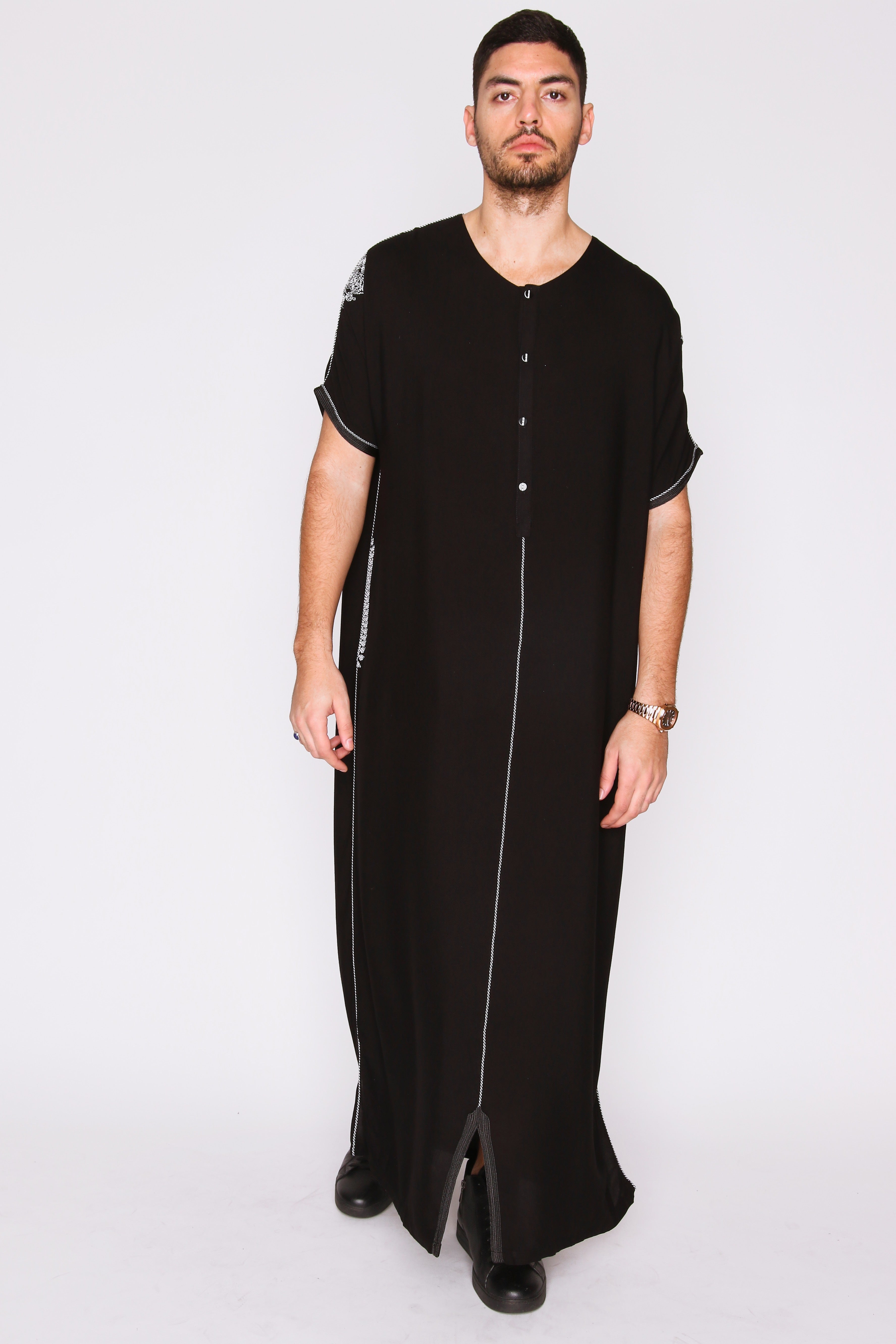 A classic gandoura in sleek black, the Panda men‰۪s robe keeps your look stylish and simple, while making accessorising easy. Finished in full-length and with short sleeves, it features a four-button close at the neck and contrast embroidery at the shoulder and pockets.