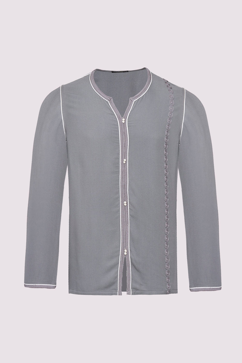 Houssni Embroidered Collarless Men's Button-Up Shirt in Grey