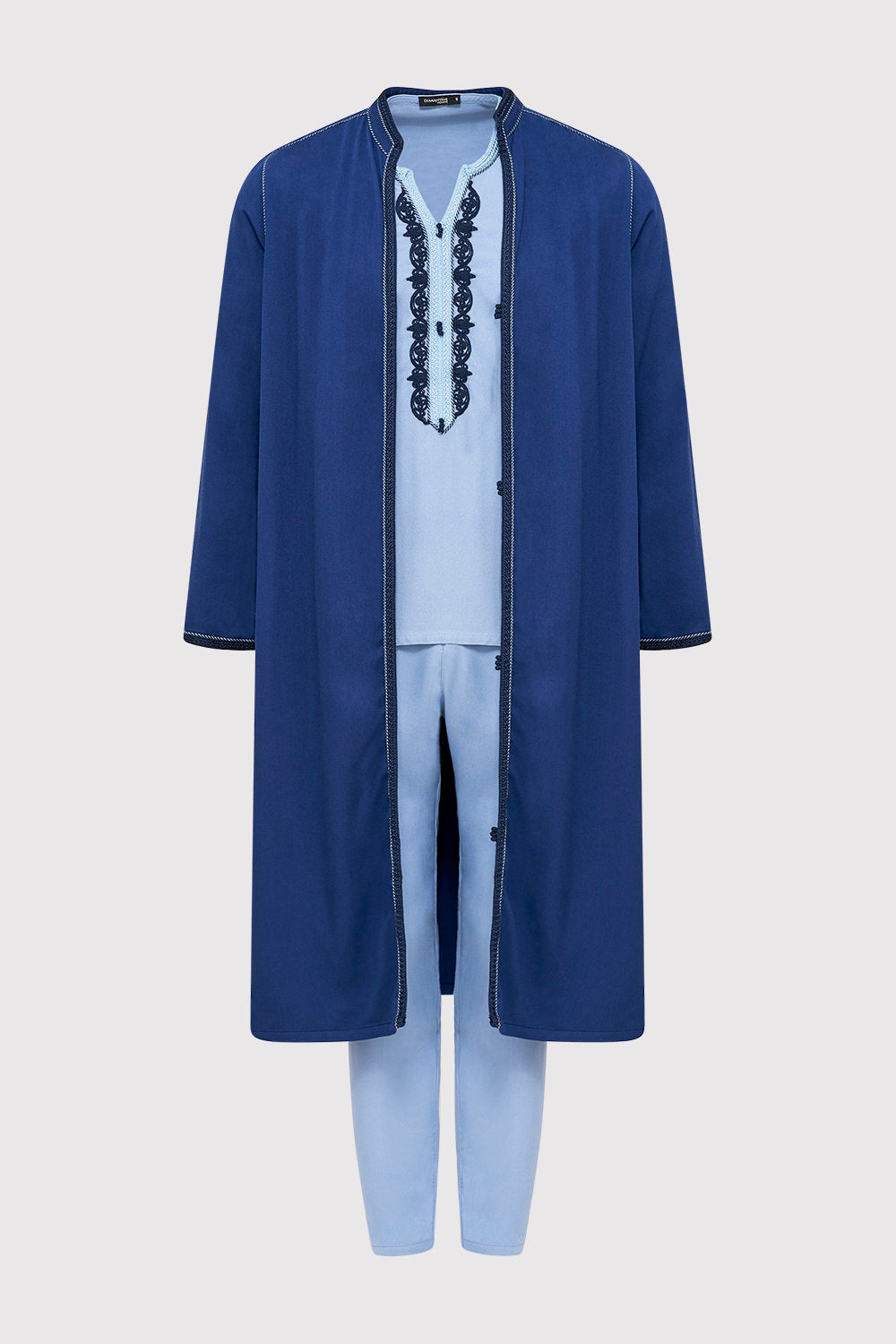 Jabador Assem Men's Tunic Top Longline Jacket and Trousers Embroidered Co-Ord Set in Blue