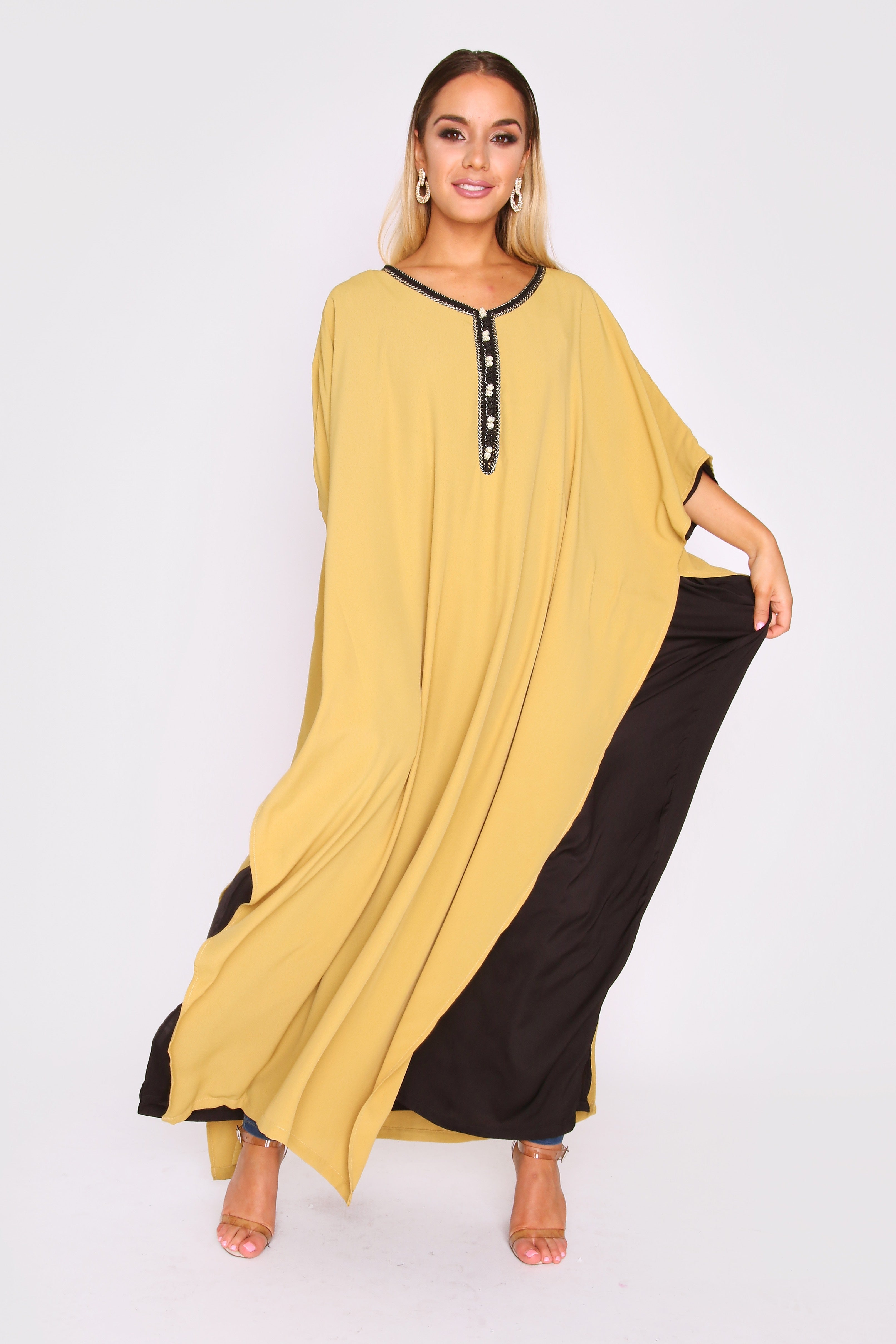 An exquisitely designed gown perfect for a more formal occasion, this beautifully soft crepeåÊkaftan combines on-trend lime green with a touch of classic black. A scooped neckline is paired with draping sleeve details and a shoulder-wrapping print, complete with a modest, loose fit.