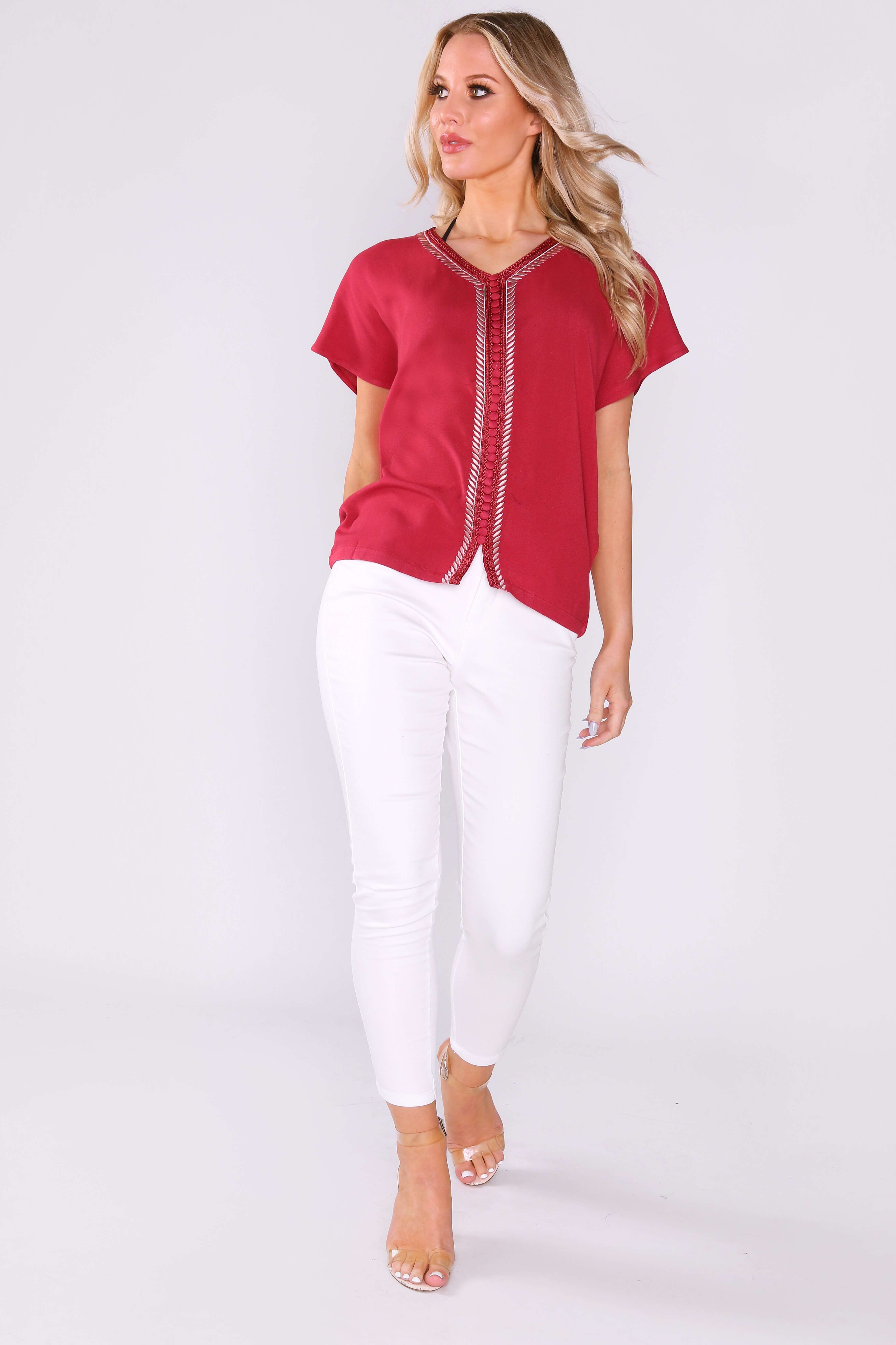 Sabah Short Sleeve V-Neck Embroidered Top in Raspberry