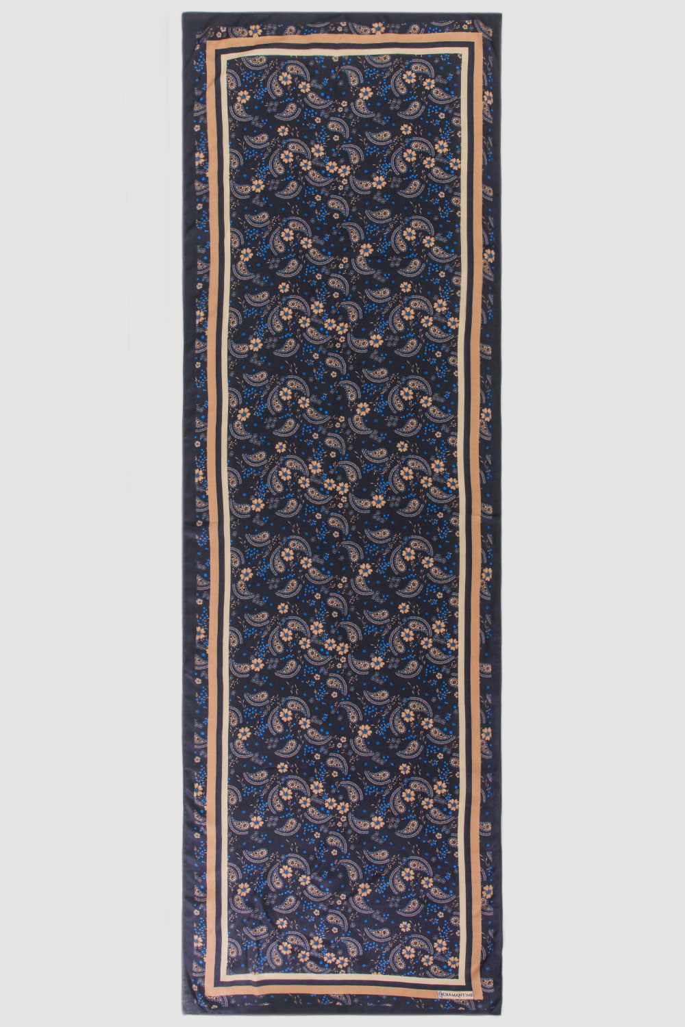 Add detail to a look with the style and effortless glam of this silk scarf from the brand-new Diamantine collection. In a rich navy blue and beige colour palette, pair the scarf with anything from simple denim to a traditional beige djellaba and wear to any occasion. Perfect for a timeless gift too.