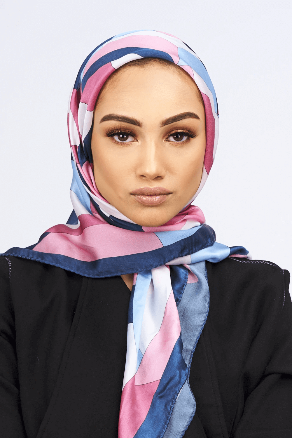 Opt for on-trend colour blocking with this stand-out silk satin scarf, perfect to style over the hair or around the neck and shoulders for extra coverage. A blended palette of powder and navy blues with layers of pink, it‰۪s the perfect choice for this season.