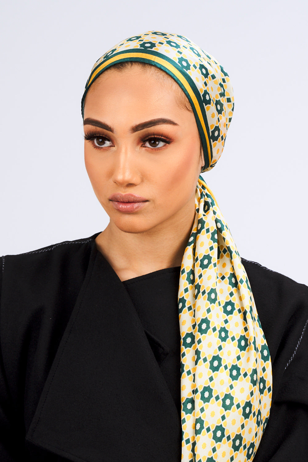 Opt for a touch of extra colour this season and add this bright printed silk satin scarf to your accessories collection. In a statement green and mustard colour palette, you‰۪re sure to turn heads with this bold print. Style around your neck, shoulders or over your hair for a look that suits your personal style.