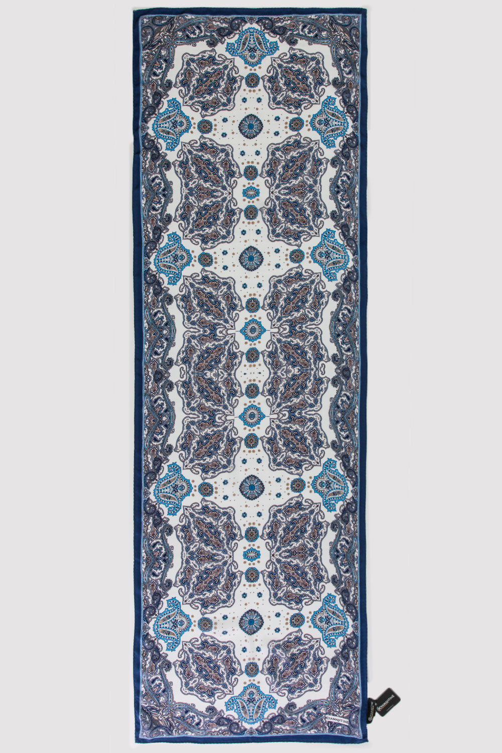 Indulge in the ultimate French Riviera vibes with this stunning navy, white and beige silk scarf from the newest collection. However you style this versatile scarf, the colour palette and intricately designed print do all the talking, letting you add some feminine style to any simple look.
