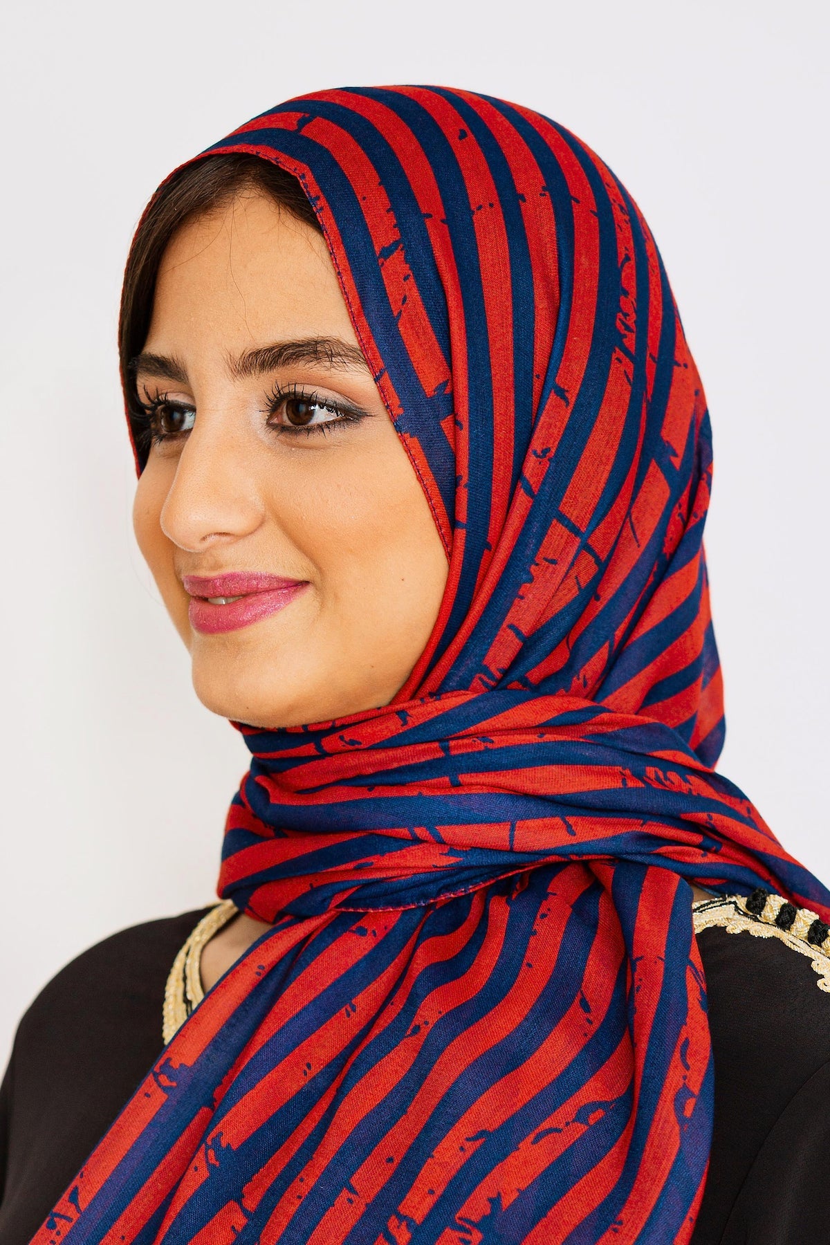 Women's Lightweight Striped Head Scarf in Marine & Red Print